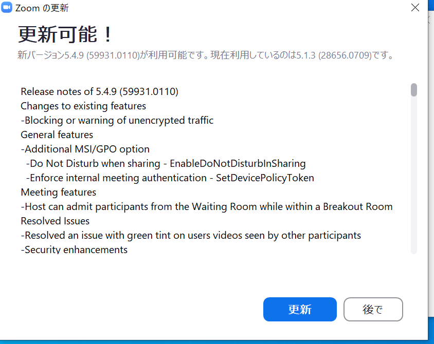 Zoom5.8.6からはオートアップデートに対応しました!