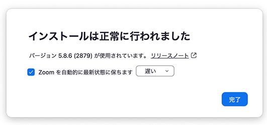 2021/12/08追記 Zoomはバーション5.8.6からオートアップデートに対応しました。アップデート後にオートアップデートのダイアログが表示されますので、「Zoomを自動的に最新状態に保ちます」にチェックを入れて、「遅い」を選択し、完了をクリックしてください。